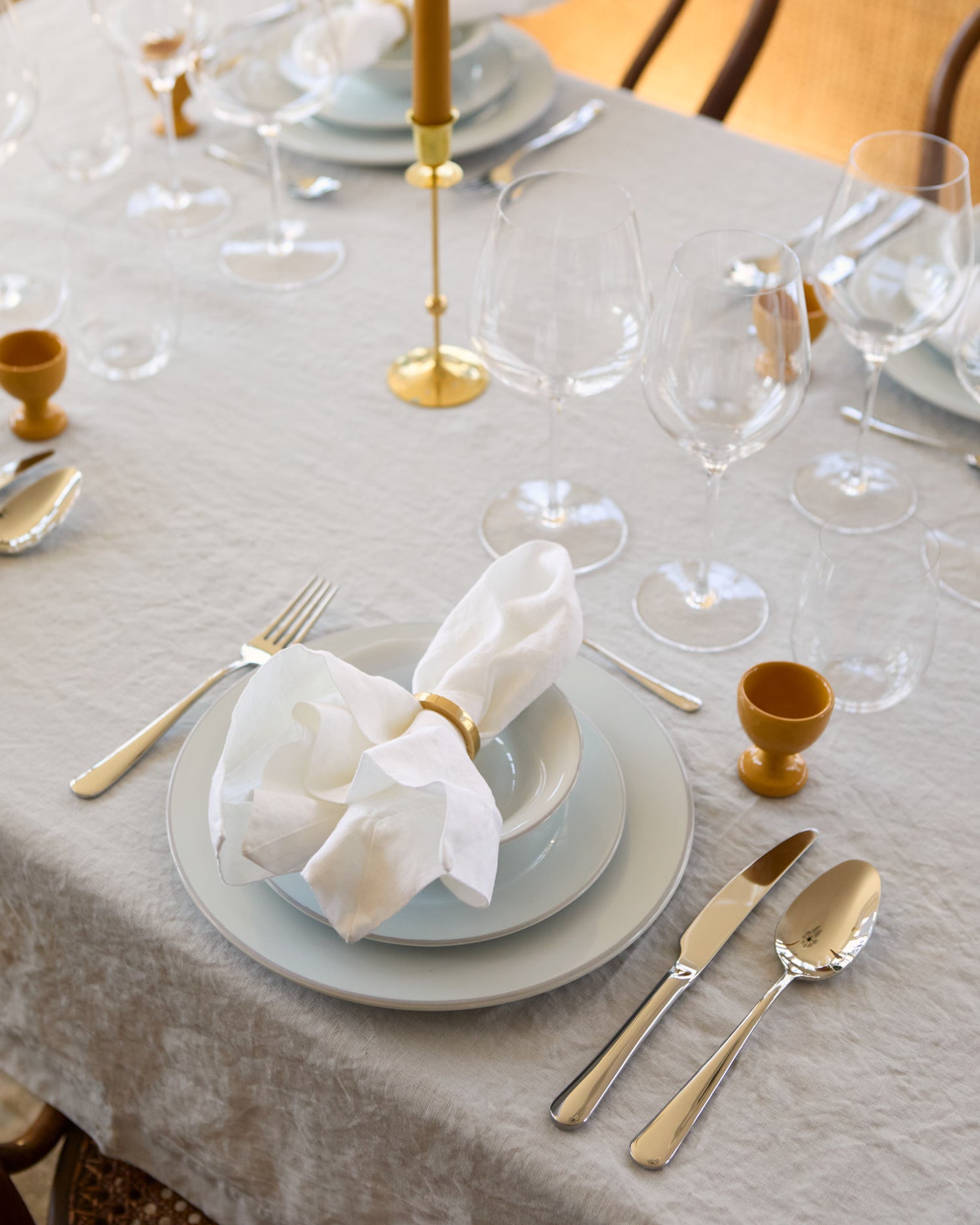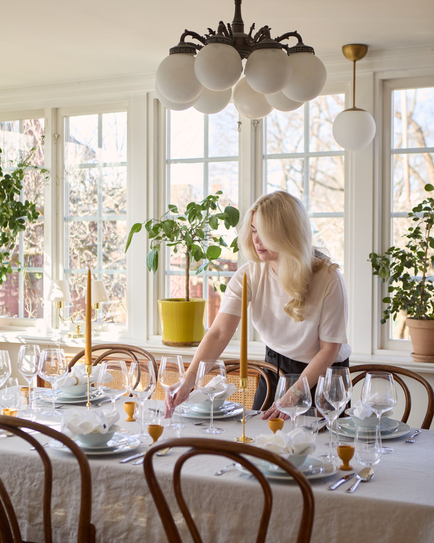 - On weekdays, we eat at our small café table in the kitchen, as it's rarely possible to sit down at the same time now that we have a baby. Then I want simple but beautiful porcelain that is quick to set up. On weekends, friends often come over spontaneously, and it's the same – simple and preferably homemade pizza or a large pasta on a platter. One thing that is never compromised is the wine glasses – they should always be beautiful even on weekdays. On the other hand, I take holidays very seriously and then the dining room is set up very carefully. I iron tablecloths, have napkins, several glasses, and flowers on the table. Filling the house with family and relatives is one of the best things I know – and seeing several generations in the family socialize fills me with joy for days afterwards.