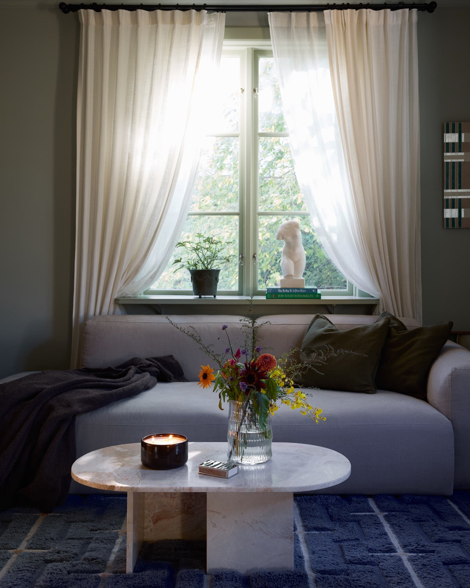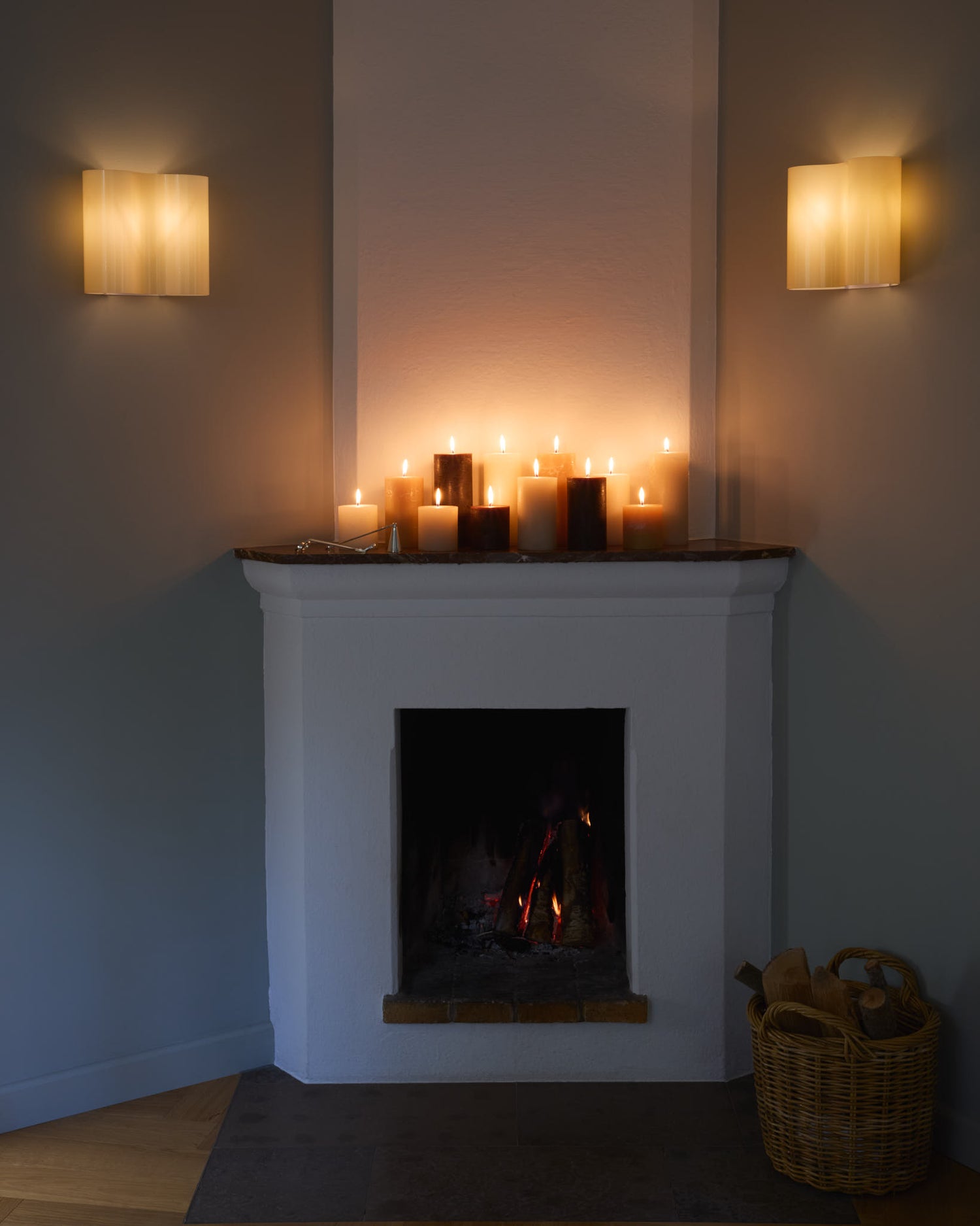 Keep it calm. Ours is a walkthrough space, so nothing too tall or heavy. A modular sofa with soft lines, meaningful art, and plenty of lighting – especially wall lamps for warmth. The fireplace is the heart of the room, surrounded by candles and soft textiles like cashmere throws and full curtains.
