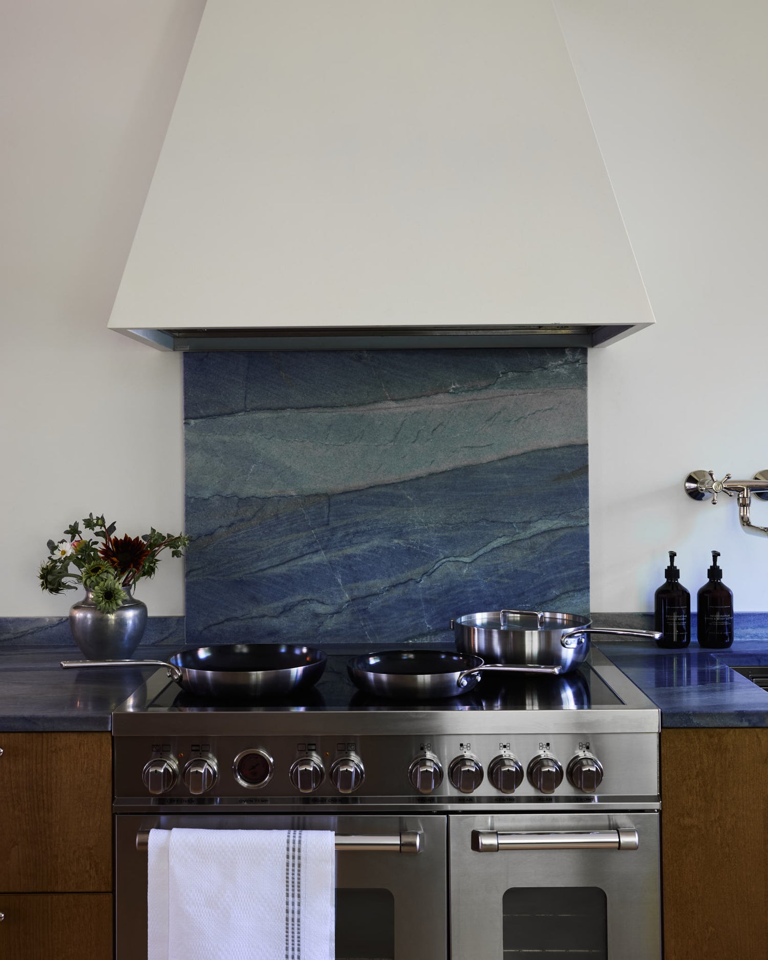 Our stove section in veneered birch, the blue stone countertop, and the mix of woods. I love combining wood tones – it makes a home feel alive. I also love the marble and Moroccan tile in our bathrooms, and the limestone in the hall. Natural materials bring warmth. And the stainless-steel counters in the kitchen and laundry – I love the contrast.