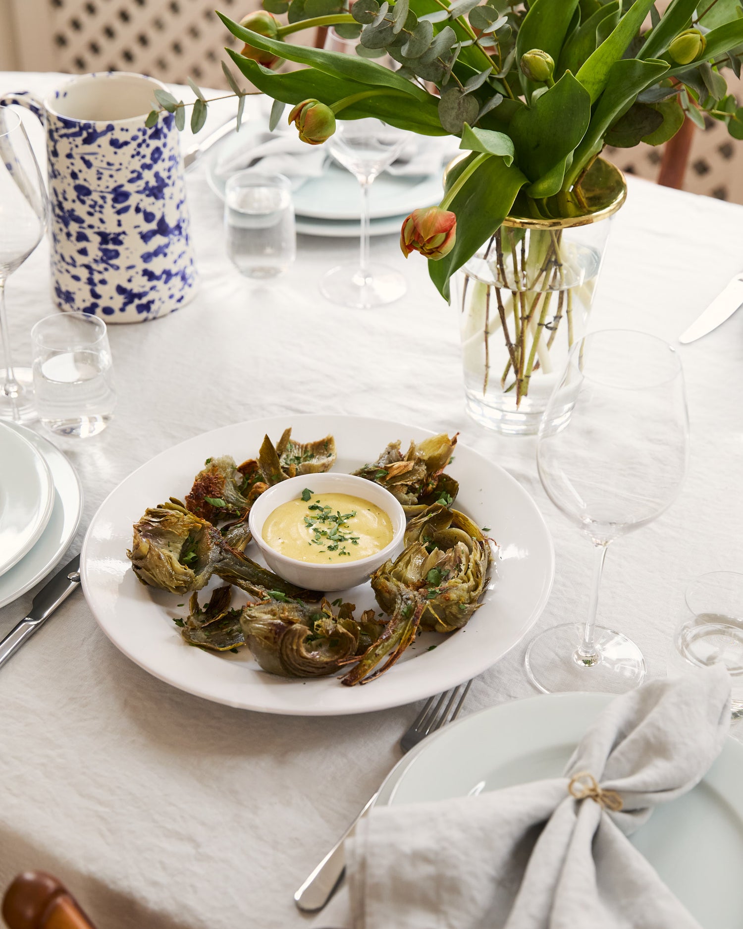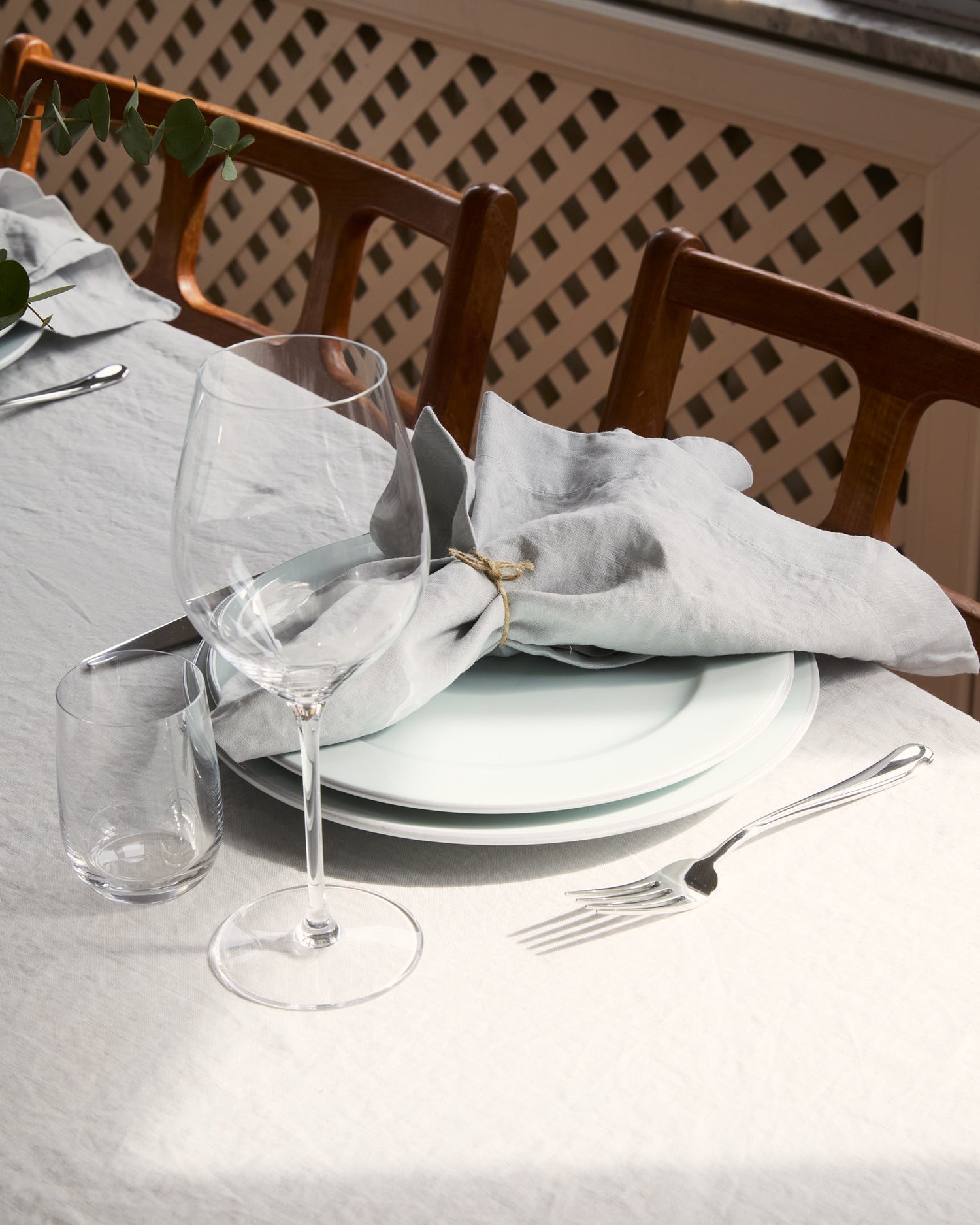 - We chose to place the dining area in the bay window to get as much light as possible. We have a Superellipse table from Bruno Mathsson, which makes the room feel airy. To create a soft tone in the kitchen, we’ve chosen to mix various materials like marble and teak. The “Linen Table Cloth of 100% Stonewashed Linen” is a favourite when it comes to table setting!